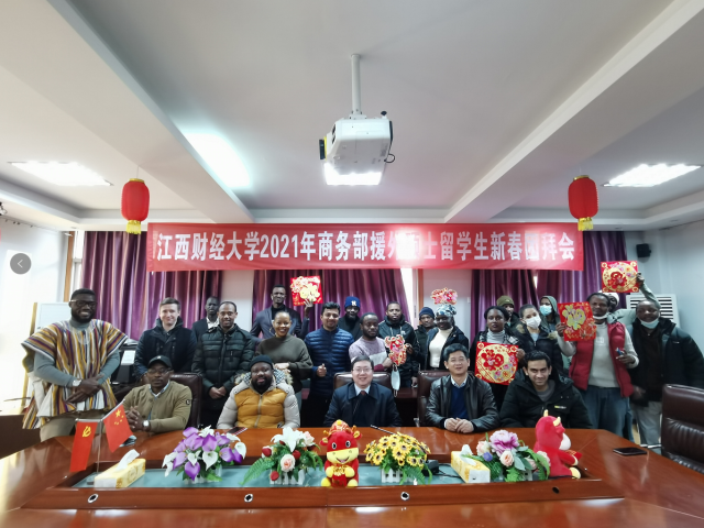 2月4日,在2021年新春佳节即将到来之际,为做好在校留学生人文关怀,让留学生感受到新年氛围,国际经贸学院组织开展了留学生新春团拜会活动。院长吴朝阳、副院长黄先明,留学生辅导员与2019级在校商务部援外国际商务专业留学生欢聚一堂,互致新春祝福,共话美好未来。团拜会由海外教育办公室许韬主持。 活动当天,国贸学院海外教育办公室工作人员和留学生们把会议室布置得喜气洋洋、年味十足,大家一起挂灯笼、贴福字,以这些传统的方式迎接新年到来。