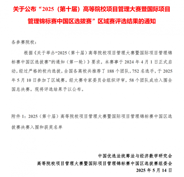 近日,由中国优选法统筹法与经济数学研究会和国际项目管理协会(IPMA)联合主办的2025(第十届)高等院校项目管理大赛暨国际项目管理锦标赛中国区选拔赛圆满落幕。我院23级国际商务专业章文辉、蒋潭两位同学经过理论知识竞赛和软件模拟竞赛两个环节的竞争角逐,分别获得本科生组个人二等奖、三等奖。这不仅彰显了我院学子在专业领域的实力,也为我院国际商务学科的教学水平和学生培养质量再添光彩。