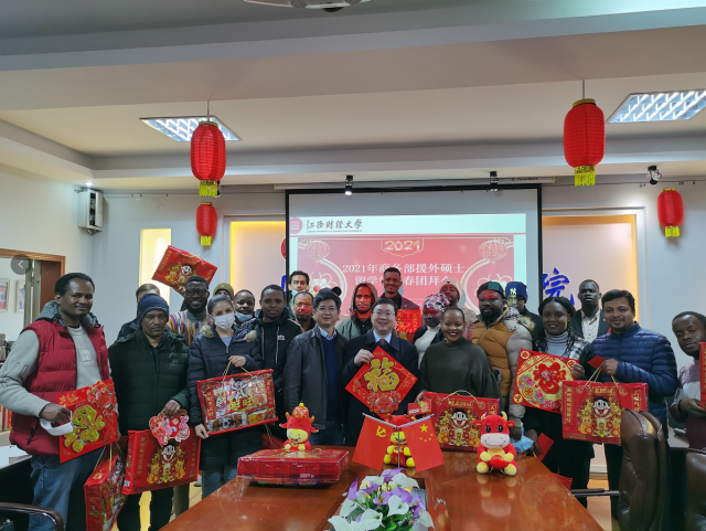 2月4日,在2021年新春佳节即将到来之际,为做好在校留学生人文关怀,让留学生感受到新年氛围,国际经贸学院组织开展了留学生新春团拜会活动。院长吴朝阳、副院长黄先明,留学生辅导员与2019级在校商务部援外国际商务专业留学生欢聚一堂,互致新春祝福,共话美好未来。团拜会由海外教育办公室许韬主持。 活动当天,国贸学院海外教育办公室工作人员和留学生们把会议室布置得喜气洋洋、年味十足,大家一起挂灯笼、贴福字,以这些传统的方式迎接新年到来。